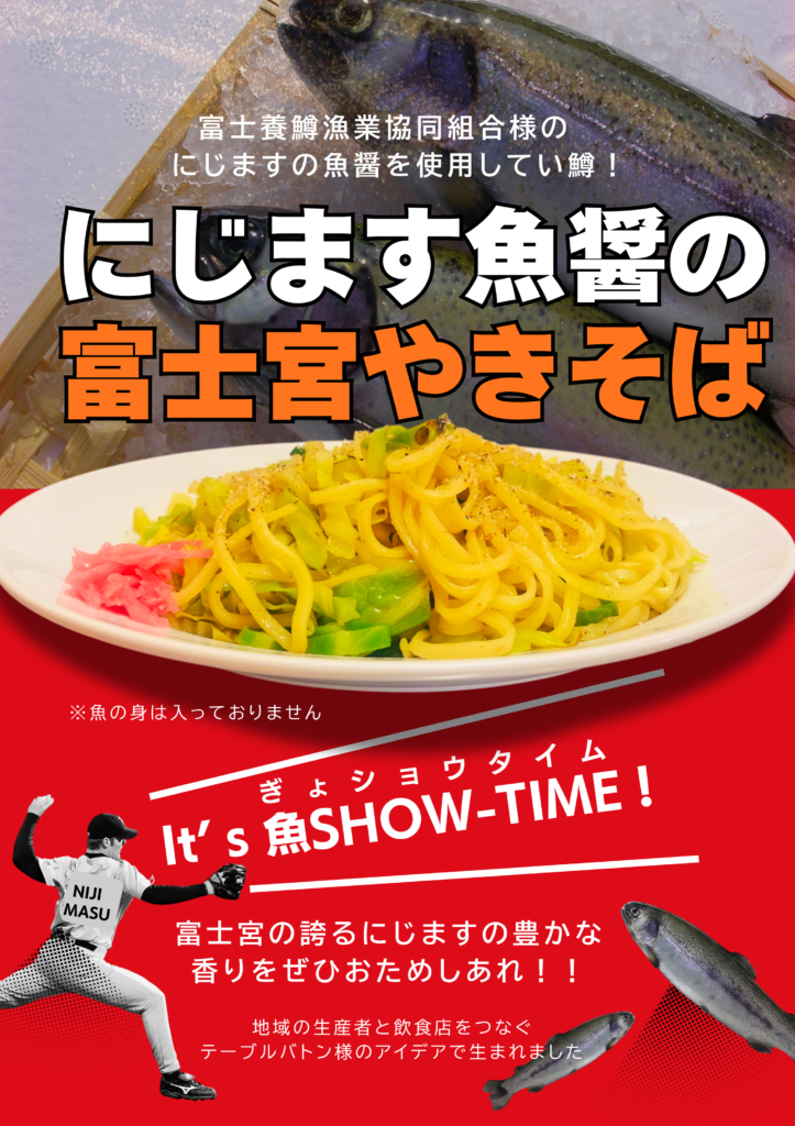 本商品は、にじますの魚醤を開発された「富士養鱒漁業協同組合」様と、地域の生産者様と飲食店様をつなぐ活動をされている「テーブルバトン」様のアイデアにより生まれた一皿です。「富士宮やきそば」の商標権者としてその普及を推進する弊社といたしましては、この深く豊かな味わいをアンテナショップから広く発信することで、市内生産者様と飲食店の皆様と共に「食のまちづくり」を一層盛り上げ、地域社会の活性化に寄与できることを切に願っております。